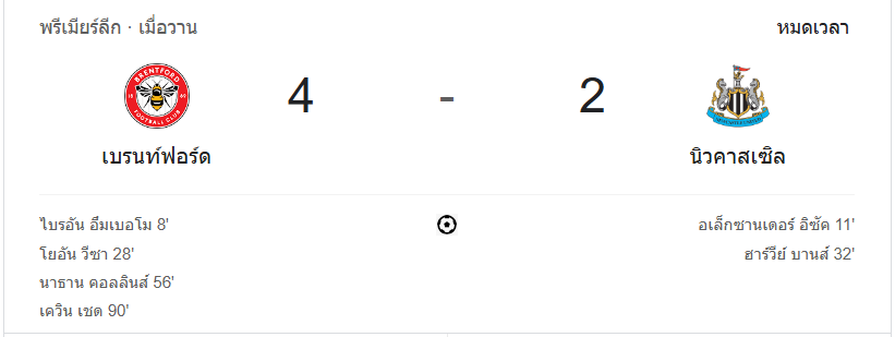 นาทีที่ 90+3: ผู้ตัดสินเป่านกหวีดหมดเวลา จบเกม เบรนท์ฟอร์ดเอาชนะนิวคาสเซิ่ลไปได้ 4-2