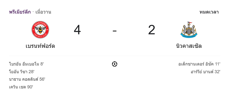 จาก : ผลบอลสด พรีเมียร์ลีก 2024 ระหว่าง เบรนท์ฟอร์ด 4-2 นิวคาสเซิ่ล ยูไนเต็ด วันนี้ 07/12/67 – บ้านกีฬา