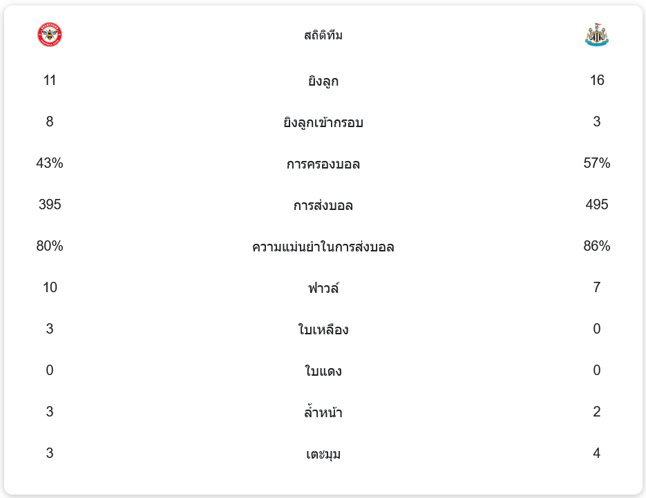 นิวคาสเซิ่ลครองบอลมากกว่า 57% และมีโอกาสยิงถึง 16 ครั้ง แต่ยิงเข้ากรอบได้เพียง 3 ครั้ง ขณะที่เบรนท์ฟอร์ดยิงทั้งหมด 11 ครั้ง และเข้ากรอบถึง 8 ครั้ง ความแม่นยำในการส่งบอลของนิวคาสเซิ่ลอยู่ที่ 86% สูงกว่าเบรนท์ฟอร์ดที่ 80% แต่เกมรับของทีมเยือนยังเสียถึง 3 ลูกในกรอบเขตโทษ