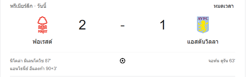 นาทีที่ 90+3 (GOAL!): แอนโธนี่ เอลังก้า (ฟอเรสต์) หลุดเข้าไปยิงในกรอบเขตโทษ บอลพุ่งผ่านผู้รักษาประตูของวิลล่าเข้าไปอย่างเด็ดขาด ฟอเรสต์พลิกแซงขึ้นนำ 2-1
