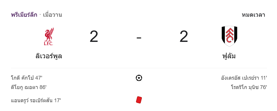 จาก : ผลบอลสด พรีเมียร์ลีก 2024 ระหว่าง ลิเวอร์พูล 2-2 ฟูแล่ม วันนี้ 14/12/67 – บ้านกีฬา