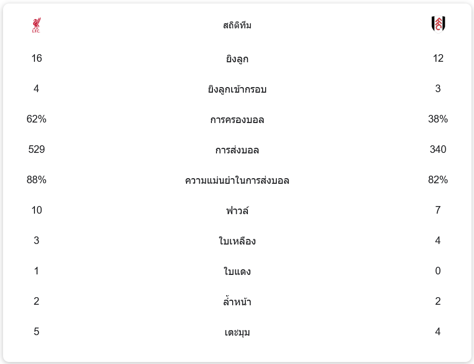 เกมนี้ลิเวอร์พูลมีโอกาสยิง 16 ครั้ง เข้ากรอบ 4 ครั้ง ขณะที่ฟูแล่มมีโอกาสยิง 12 ครั้ง เข้ากรอบ 3 ครั้ง การครองบอลของลิเวอร์พูลอยู่ที่ 62% และฟูแล่ม 38% จำนวนการส่งบอลของลิเวอร์พูลมากถึง 529 ครั้งด้วยความแม่นยำ 88% ส่วนฟูแล่มส่งบอล 340 ครั้ง ความแม่นยำ 82%