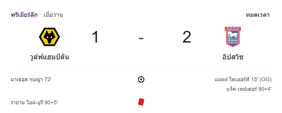 จาก : ผลบอลสด พรีเมียร์ลีก 2024 ระหว่าง วูล์ฟแฮมป์ตัน 1-2 อิปสวิช ทาวน์ วันนี้ 14/12/67 – บ้านกีฬา