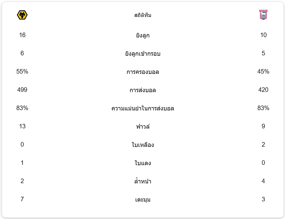 วูล์ฟแฮมป์ตันครองบอล 55% เทียบกับอิปสวิช 45% เจ้าบ้านยิงทั้งหมด 16 ครั้ง เข้ากรอบ 6 ครั้ง ขณะที่ทีมเยือนมีโอกาสยิง 10 ครั้ง เข้ากรอบ 5 ครั้ง ทั้งสองทีมมีความแม่นยำในการส่งบอลที่ 83%