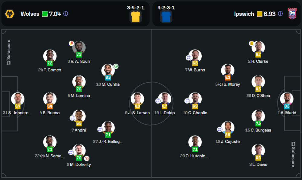 มาเตอุส กุนญ่า ของวูล์ฟแฮมป์ตัน ได้คะแนน 8.3 จากการยิงประตูสำคัญและการมีส่วนร่วมในเกมรุกที่โดดเด่น