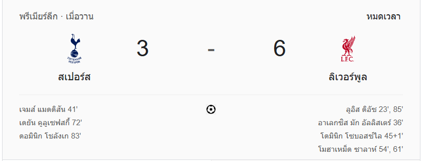 นาทีที่ 90+6: ผู้ตัดสินเป่านกหวีดยาว จบเกม ลิเวอร์พูลเอาชนะสเปอร์สด้วยสกอร์ 6-3 ในเกมที่เต็มไปด้วยความดุเดือดตั้งแต่ต้นจนจบ