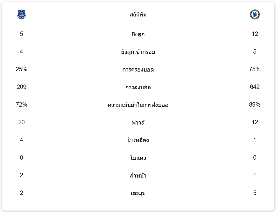 เอฟเวอร์ตันมีโอกาสยิงเพียง 5 ครั้ง (4 ครั้งเข้ากรอบ) ส่วนเชลซี ยิงทั้งหมด 12 ครั้ง (5 ครั้งเข้ากรอบ) ความแม่นยำในการจ่ายบอลของเชลซีโดดเด่นที่ 89% ขณะที่เอฟเวอร์ตันทำได้ 72% การฟาวล์เกิดขึ้นถึง 32 ครั้ง และเอฟเวอร์ตันได้รับใบเหลืองถึง 4 ใบ