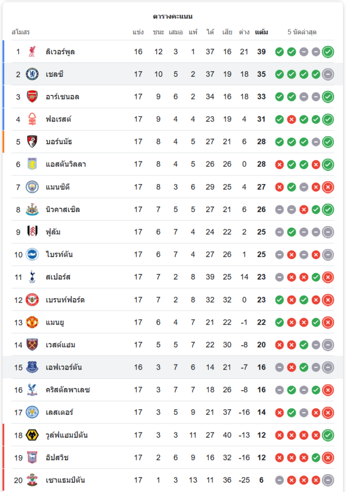 เชลซียังรั้งอันดับ 2 มี 35 คะแนนจาก 17 นัด ส่วนเอฟเวอร์ตันอยู่อันดับ 15 มี 16 คะแนนจาก 16 นัด