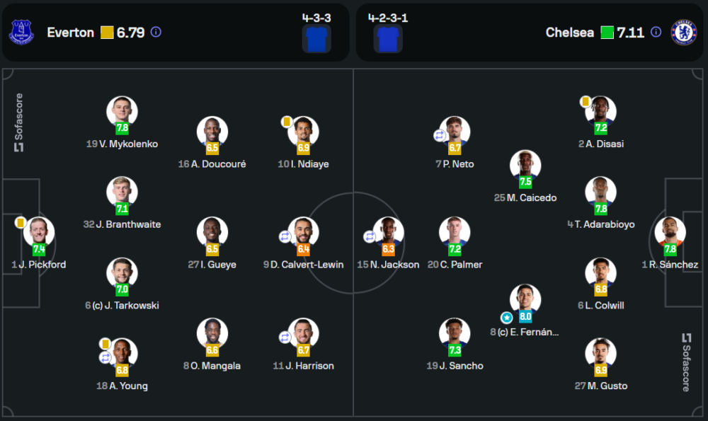 เอฟเวอร์ตันวางแผน 4-3-3 ที่เน้นความเหนียวแน่นในแดนหลัง พร้อมการใช้ปีกทั้งสองข้างโจมตีสวนกลับ แต่จังหวะสุดท้ายขาดความเฉียบขาด ขณะที่เชลซีในแผน 4-2-3-1 ครองบอลถึง 75% และใช้การจ่ายบอลสั้นผสมยาวที่แม่นยำถึง 89% แต่ยังเจาะแนวรับของเอฟเวอร์ตันไม่สำเร็จ