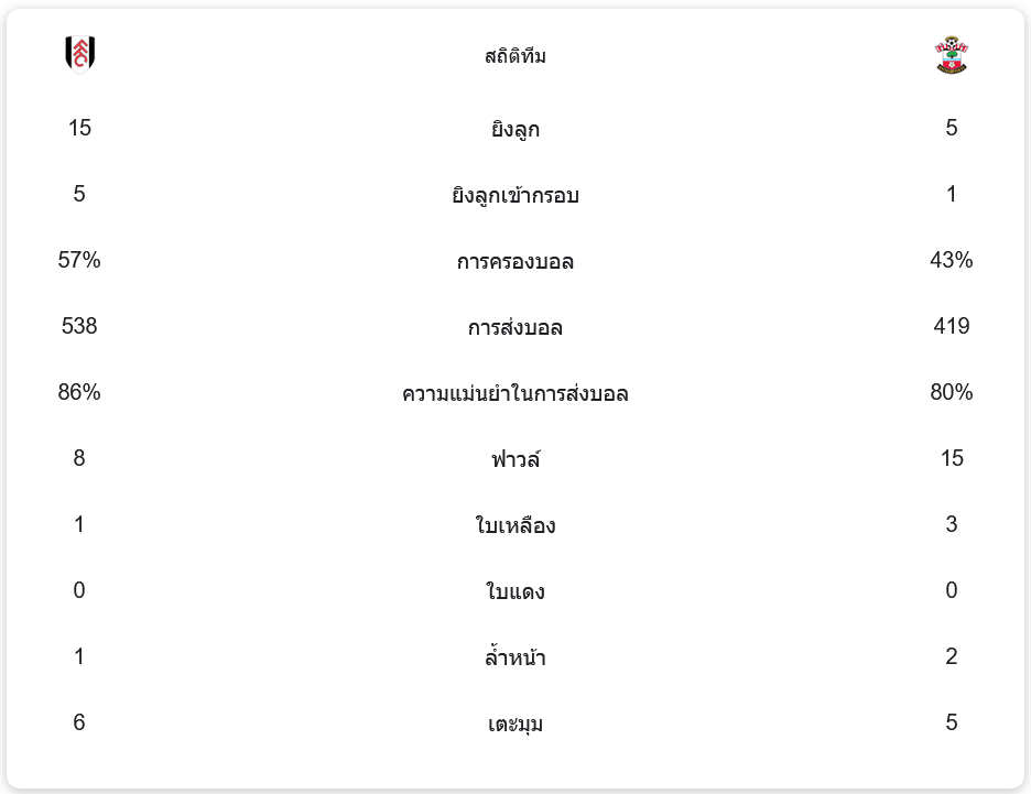 ฟูแล่มมีโอกาสยิงมากถึง 15 ครั้ง แต่เข้ากรอบเพียง 5 ครั้ง ขณะที่เซาแธมป์ตันยิงได้ 5 ครั้ง และเข้ากรอบเพียง 1 ครั้ง การครองบอลของฟูแล่มดีกว่าที่ 57% เทียบกับเซาแธมป์ตัน 43% โดยฟูแล่มมีการส่งบอลสำเร็จถึง 538 ครั้ง คิดเป็น 86% ส่วนเซาแธมป์ตันส่งบอลสำเร็จ 419 ครั้ง คิดเป็น 80%