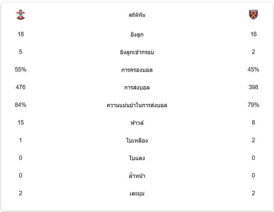 เซาแธมป์ตันครองบอลได้ 55% และมีโอกาสยิง 18 ครั้ง แต่ไม่สามารถทำประตูได้ ส่วนเวสต์แฮมแม้ครองบอลน้อยกว่า (45%) แต่ความเฉียบคมในแดนหน้าส่งผลให้พวกเขายิงได้ 1 ประตูจากโอกาส 16 ครั้ง ความแม่นยำในการส่งบอลของเวสต์แฮมอยู่ที่ 79%