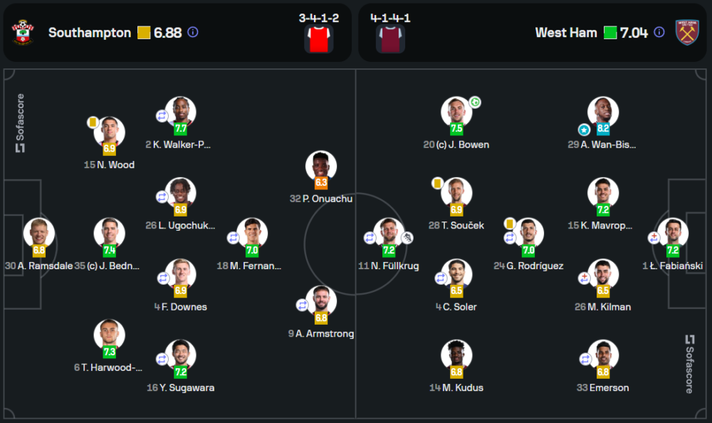 เซาแธมป์ตันใช้ระบบ 3-4-1-2 เน้นการครองบอลในแดนกลางและส่งต่อบอลยาวไปยังโอนูอาชู ขณะที่เวสต์แฮมเลือกเล่นเกมรับแบบ 4-1-4-1 ที่มีฟูลครูกเป็นเป้าหมายสำคัญในแดนหน้า วิเคราะห์บอล จากรูปเกมพบว่าเวสต์แฮมมีความได้เปรียบในด้านการโต้กลับเร็วที่สร้างความกดดันต่อแนวรับของเซาแธมป์ตัน