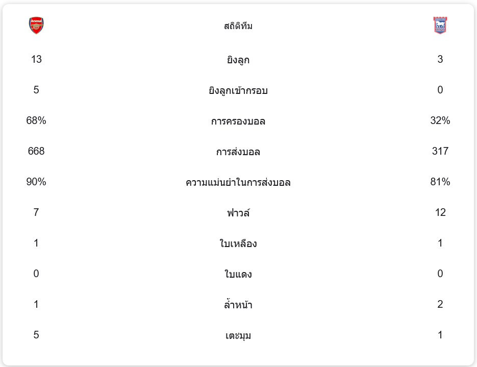 อาร์เซนอลครองบอลเหนือกว่าอย่างชัดเจน ยิงทั้งหมด 13 ครั้ง เข้ากรอบ 5 ครั้ง ขณะที่อิปสวิชยิงเพียง 3 ครั้ง และไม่เข้ากรอบเลย การผ่านบอลของอาร์เซนอลสูงถึง 668 ครั้ง เทียบกับอิปสวิชที่ทำได้ 317 ครั้ง สะท้อนความต่างชั้นของทั้งสองทีม