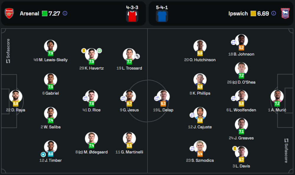 ยูร์เรียน ทิมเบอร์ (อาร์เซนอล) โชว์ฟอร์มเด่นทั้งการตัดบอลและการสร้างเกมจากแนวหลัง รับคะแนนสูงสุด 8.0 ในเกมนี้