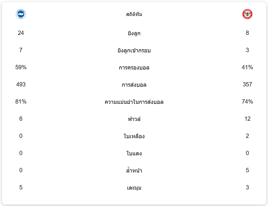 ไบรท์ตันยิงทั้งหมด 24 ครั้ง เข้ากรอบ 7 ครั้ง ขณะที่เบรนท์ฟอร์ดยิงเพียง 8 ครั้ง เข้ากรอบ 3 ครั้ง การครองบอล 59% ของไบรท์ตัน และการผ่านบอล 493 ครั้งที่แม่นยำถึง 81% สะท้อนถึงการบุกที่ต่อเนื่อง