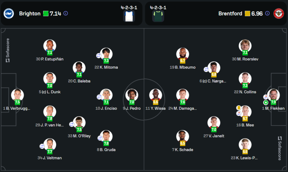 ไบรท์ตันใช้แผน 4-2-3-1 โดยเน้นการครองบอลและโจมตีผ่านด้านข้างจากความเร็วของ มิโตมะ และการวางบอลลึกของบาลีบา แต่จบสกอร์ไม่คม ขณะที่เบรนท์ฟอร์ด ใช้การตั้งรับลึกและโต้กลับไว โดยเน้นการเชื่อมเกมจากนอร์การ์ด สถิติครองบอล 59% ของไบรท์ตันเทียบกับ 41% ของเบรนท์ฟอร์ด แสดงให้เห็นถึงความต่างในแผนการเล่น
