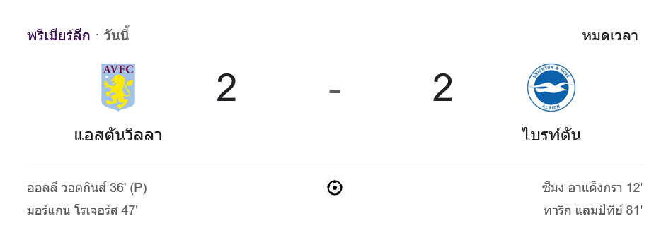 - ⚽ นาทีที่ 47: มอร์แกน โรเจอร์ส ยิงให้แอสตัน วิลล่านำ 2-1