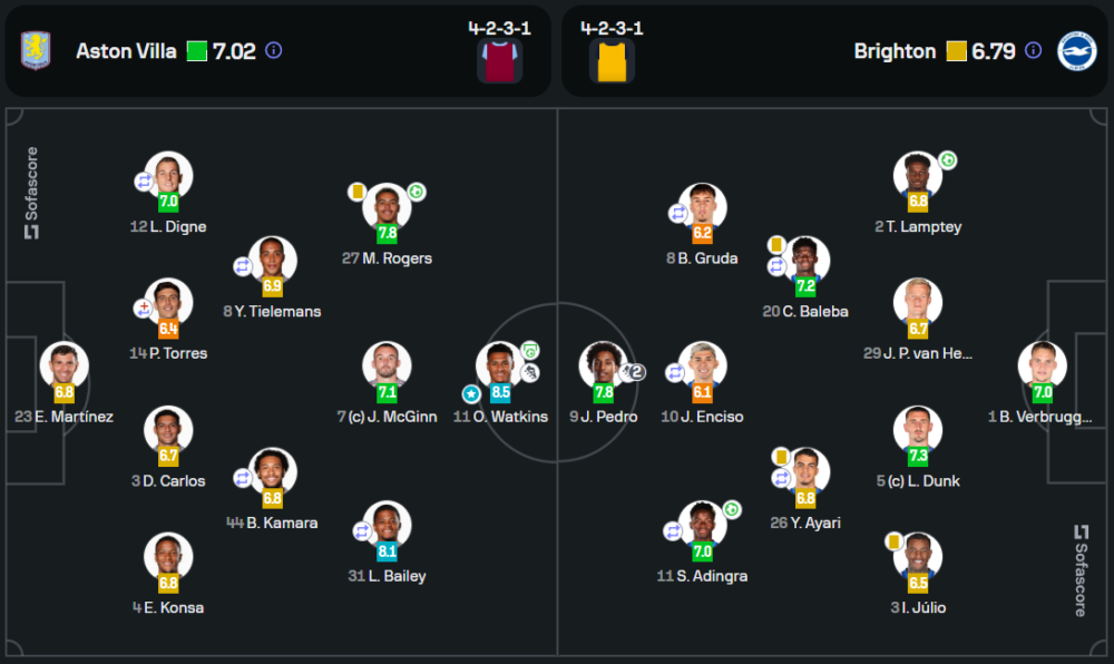 แอสตัน วิลล่าครองบอลมากกว่า 60% และมีโอกาสยิง 20 ครั้งเทียบกับ 13 ครั้งของไบรท์ตัน แต่ทั้งสองทีมยิงเข้ากรอบเพียง 4 ครั้งเหมือนกัน เกมนี้แสดงให้เห็นถึงการวางแผนที่รัดกุมและการเล่นอย่างมีวินัยของทั้งสองฝ่าย