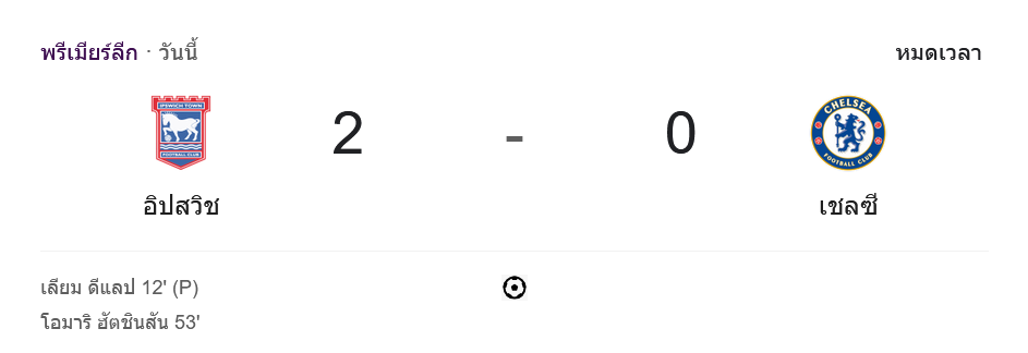 - ⚽ นาทีที่ 12: เลียม ดีแลป ยิงจุดโทษให้อิปสวิชขึ้นนำ 1-0