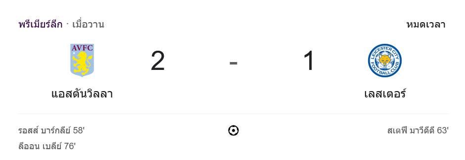 - ⚽ 76’ ลีออน ไบลีย์ ยิงประตูชัยให้แอสตัน วิลล่า 2-1