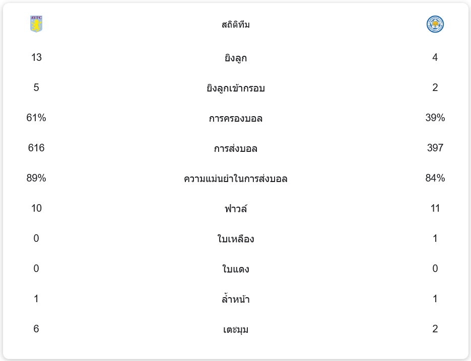 แอสตัน วิลล่ามีโอกาสยิง 13 ครั้ง เข้ากรอบ 5 ครั้ง ครองบอล 61% และส่งบอลแม่นยำถึง 89% ขณะที่เลสเตอร์ ซิตี้ยิงเพียง 4 ครั้ง เข้ากรอบ 2 ครั้ง การครองบอลอยู่ที่ 39% และส่งบอลแม่นยำ 84% แสดงถึงการเป็นรองในเกม