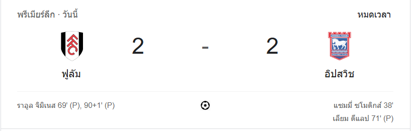 ผลบอลสด พรีเมียร์ลีก 2024 ระหว่าง ฟูแล่ม 2-2 อิปสวิช ทาวน์ วันนี้ 5/1/68