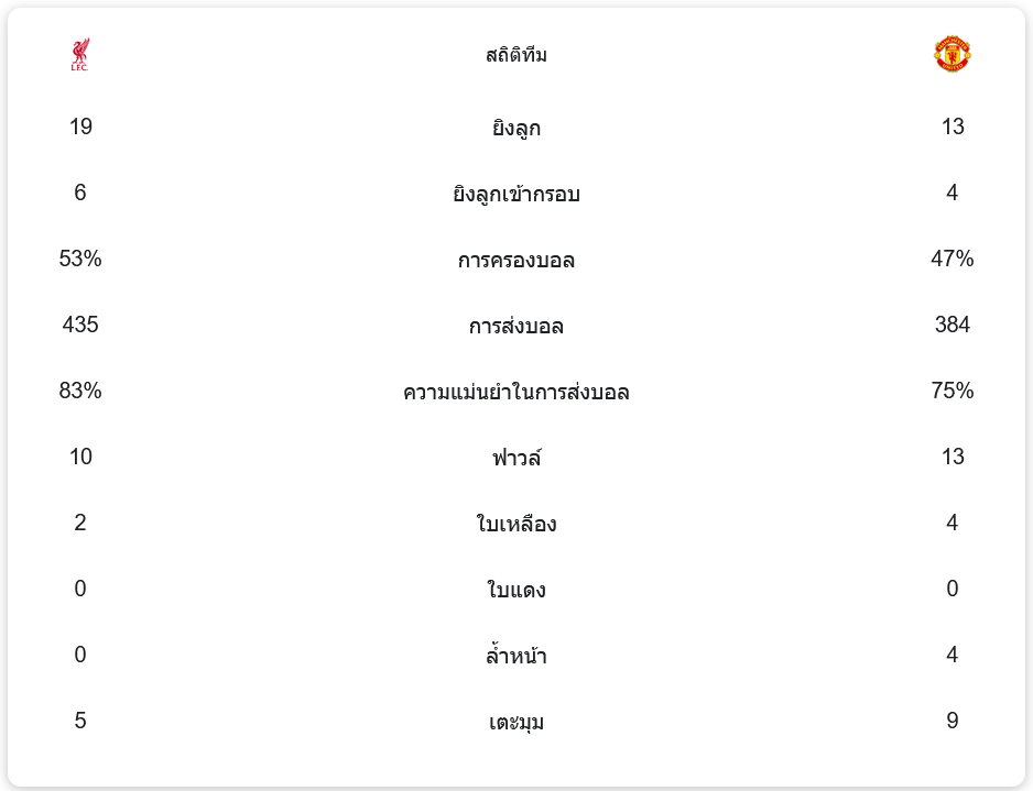 ลิเวอร์พูลครองบอลได้ 53% และมีโอกาสยิง 19 ครั้ง โดยเข้ากรอบ 6 ครั้ง ขณะที่แมนฯ ยูไนเต็ดครองบอล 47% และมีโอกาสยิง 13 ครั้ง เข้ากรอบ 4 ครั้ง ทั้งสองทีมเล่นกันดุเดือดจนมีใบเหลืองรวมกันถึง 6 ใบ และฟาวล์รวมกันถึง 23 ครั้ง
