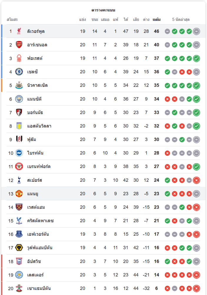 ลิเวอร์พูลยังคงนำเป็นจ่าฝูง มี 46 คะแนนจาก 19 นัด ส่วนแมนเชสเตอร์ ยูไนเต็ดอยู่อันดับที่ 13 มี 23 คะแนน การแบ่งแต้มครั้งนี้ช่วยให้ลิเวอร์พูลยังคงรักษาช่องว่างจากทีมรองจ่าฝูงไว้ได้