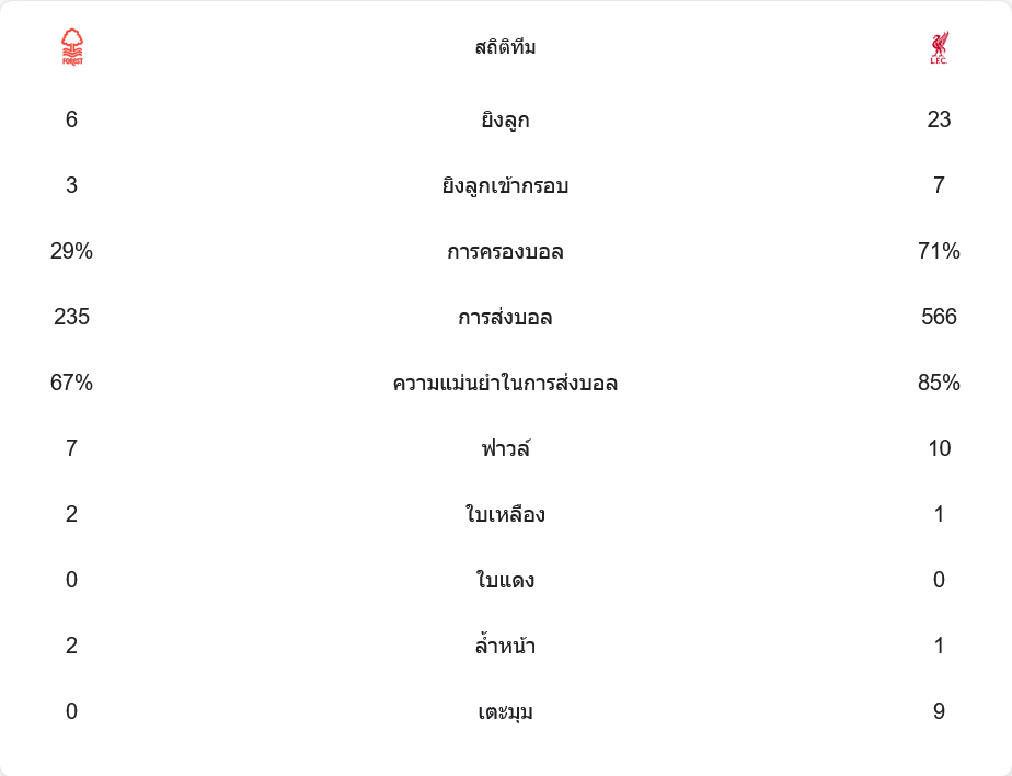 เกมนี้ลิเวอร์พูลครองบอลได้ถึง 71% และมีโอกาสยิง 23 ครั้ง ในขณะที่ฟอเรสต์มีโอกาสยิงเพียง 6 ครั้ง แต่เกมรับของฟอเรสต์ทำงานได้อย่างมีวินัย ขณะที่ผู้รักษาประตู มัตซ์ เซลส์ โชว์ฟอร์มสุดยอด