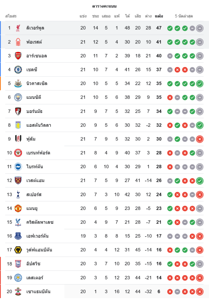 ฟอเรสต์มี 41 คะแนนจาก 21 นัด ยังคงรักษาอันดับ 2 ส่วนลิเวอร์พูลมี 47 คะแนนจาก 20 นัด ครองจ่าฝูงต่อไป