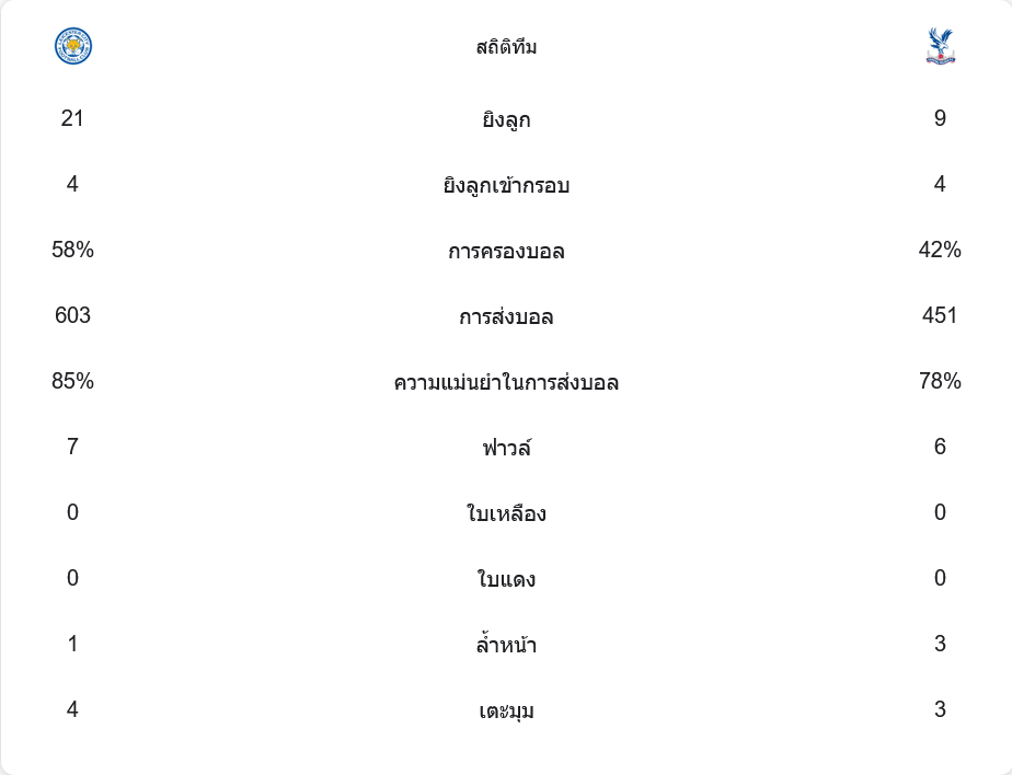 แม้เลสเตอร์จะครองบอลมากกว่าที่ 58% และส่งบอลได้ถึง 603 ครั้ง แต่ทีมเยือนมีเกมรับและสวนกลับที่เด็ดขาด โอกาสยิงของทั้งสองทีมไม่ต่างกันมาก (เลสเตอร์ 21 ครั้ง, พาเลซ 9 ครั้ง) แต่พาเลซยิงเข้ากรอบ 4 ครั้ง และเปลี่ยนเป็น 2 ประตู