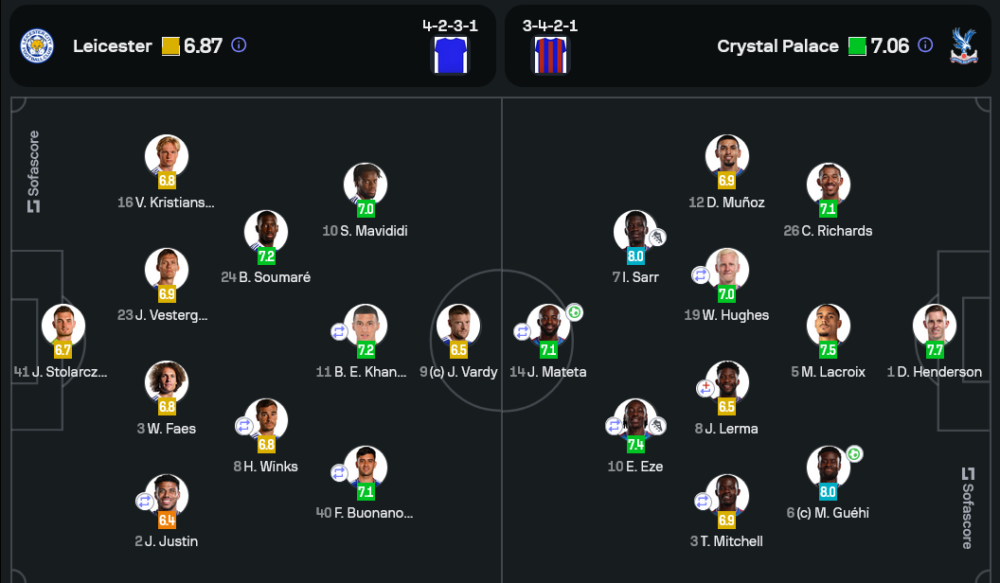 เลสเตอร์ ซิตี้ ใช้แผน 4-2-3-1 ที่เน้นการครองบอลและส่งบอลแม่นยำ แต่ขาดความเฉียบคมในจังหวะสุดท้าย แม้จะมีโอกาสยิงถึง 21 ครั้ง แต่เข้ากรอบเพียง 4 ครั้ง ขณะที่ คริสตัล พาเลซ ใช้แผน 3-4-2-1 ที่เน้นเกมรับเหนียวแน่นและรอจังหวะสวนกลับ โดยอาศัยความเร็วของ อิสไมลา ซาร์ และความคมของ ฌอง-ฟิลิปป์ มาเตต้า