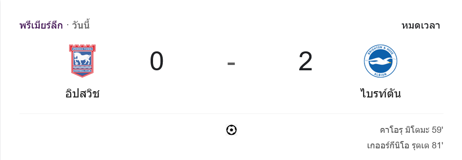 ช่วงท้ายเกม อิปสวิชพยายามเร่งเกมหวังทวงประตูคืน แต่แนวรับของไบรท์ตันยังเล่นได้อย่างแข็งแกร่ง และคุมสถานการณ์ไว้ได้ทั้งหมด ก่อนที่ผู้ตัดสินจะเป่าหมดเวลา ส่งผลให้ ไบรท์ตัน โฮฟ อัลเบี้ยน คว้าชัยชนะ 2-0 กลับบ้านไปได้สำเร็จ