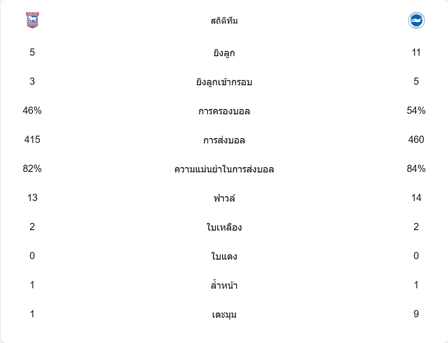 ไบรท์ตันเป็นฝ่ายครองบอลเหนือกว่าอิปสวิชที่ 54% ต่อ 46% และมีโอกาสยิงทั้งหมด 11 ครั้ง ซึ่งมากกว่าทีมเจ้าบ้านที่ทำได้เพียง 5 ครั้ง โดยในจำนวนนี้ ไบรท์ตันยิงเข้ากรอบ 5 ครั้ง ขณะที่อิปสวิชมีโอกาสยิงตรงกรอบแค่ 3 ครั้ง ความแม่นยำในการส่งบอลของไบรท์ตันก็อยู่ในระดับที่เหนือกว่าที่ 84% เทียบกับอิปสวิชที่ทำได้ 82%