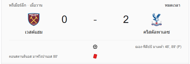 นาทีที่ 80: คอนสแตนตินอส มาฟโรปานอส (เวสต์แฮม) โดนใบเหลืองที่สอง กลายเป็นใบแดง ทำให้เวสต์แฮมเหลือผู้เล่นเพียง 10 คน