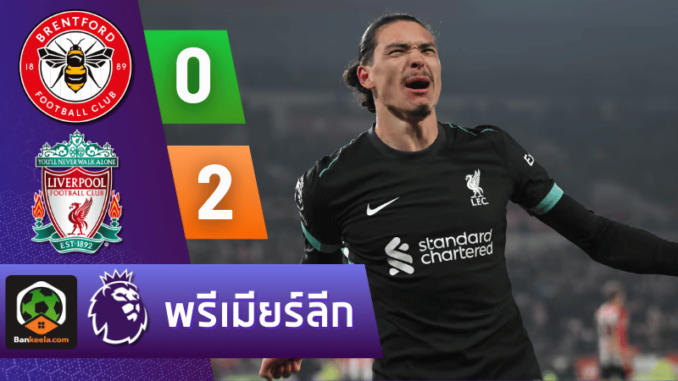 ศึก พรีเมียร์ลีก 2024 นัดสำคัญที่สนามจีเทค คอมมูนิตี้ สเตเดี้ยม ลิเวอร์พูล โชว์พลังแชมป์ด้วยการบุกคว้าชัยเหนือ เบรนท์ฟอร์ด 2-0 แม้เกมจะอึดอัดเกือบตลอด 90 นาที แต่ ดาร์วิน นูนเญซ ก็แสดงให้เห็นถึงความเฉียบคมในช่วงทดเวลาบาดเจ็บ กดคนเดียวสองประตูช่วยให้ “หงส์แดง” คว้าสามแต้มสำคัญ และยังคงนำเป็นจ่าฝูงของลีกอย่างเหนียวแน่น