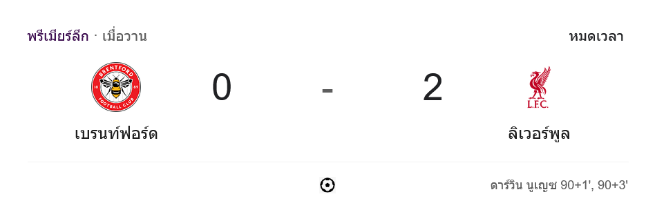 จากนั้นไม่กี่นาที ลิเวอร์พูลตอกย้ำชัยชนะ 90+3 ด้วยลูกยิงของ นูนเญซ อีกครั้ง คราวนี้เป็น ฮาร์วีย์ เอลเลียตต์ ที่ไหลบอลให้ดาวยิงอุรุกวัยหลุดเข้าไปซัดผ่านมือเฟล็คเค่น จบเกม ลิเวอร์พูล บุกเอาชนะ เบรนท์ฟอร์ด 2-0 เก็บสามแต้มสำคัญ