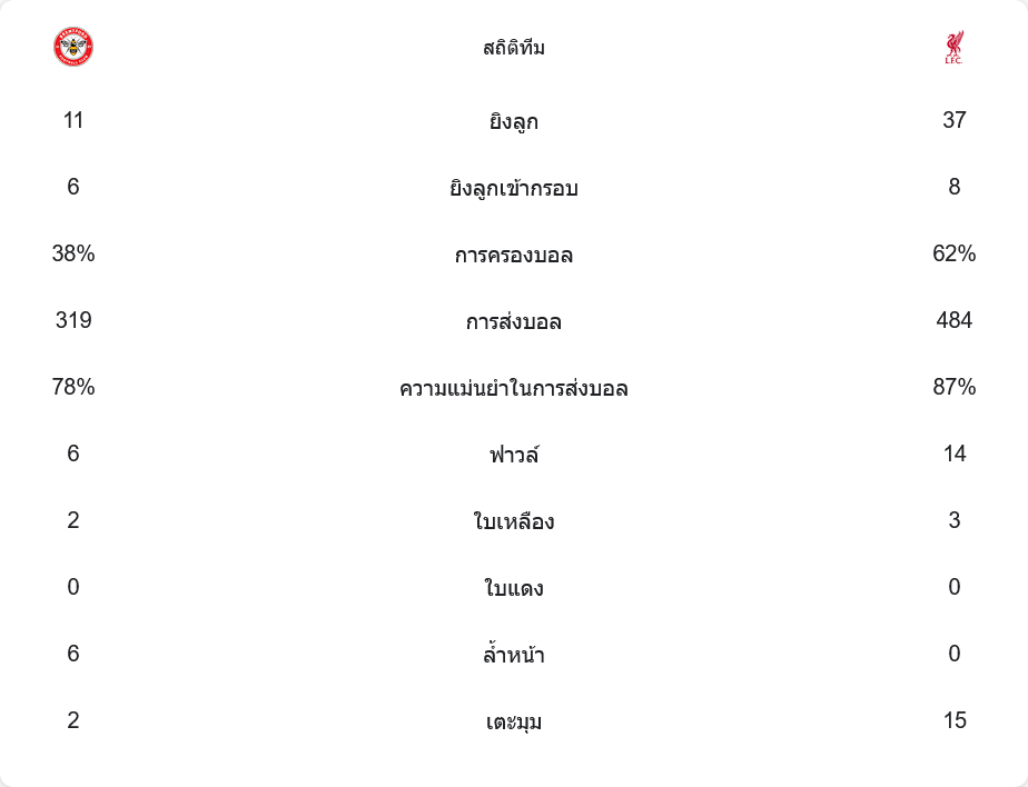 ลิเวอร์พูลยิงทั้งหมด 37 ครั้ง เข้ากรอบ 8 ครั้ง ขณะที่เบรนท์ฟอร์ดยิง 11 ครั้ง เข้ากรอบ 6 ครั้ง ลิเวอร์พูลครองบอลมากกว่าชัดเจนที่ 62% เทียบกับเบรนท์ฟอร์ดที่ 38% ลิเวอร์พูลผ่านบอลแม่นยำ 87% ส่วนเบรนท์ฟอร์ดอยู่ที่ 78% ลิเวอร์พูลฟาวล์ 14 ครั้ง ได้ใบเหลือง 3 ใบ ขณะที่เบรนท์ฟอร์ดฟาวล์ 6 ครั้ง ได้ใบเหลือง 2 ใบ