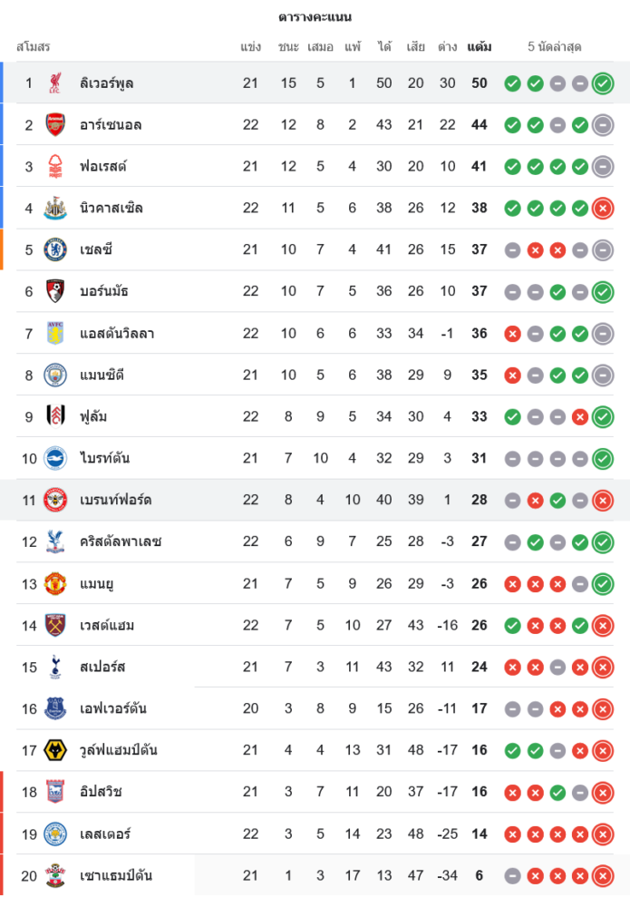 ลิเวอร์พูลยังคงนำเป็นจ่าฝูงของ พรีเมียร์ลีก 2024 ด้วย 50 คะแนน นำห่างอันดับสอง อาร์เซน่อล ขณะที่เบรนท์ฟอร์ดยังคงรั้งอันดับ 11 มี 28 คะแนน