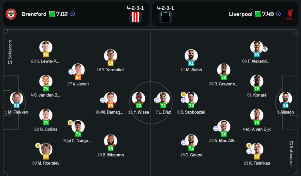 แม้ลิเวอร์พูลจะมีโอกาสยิงถึง 37 ครั้ง แต่ขาดความเฉียบขาดในการจบสกอร์ ขณะที่เบรนท์ฟอร์ดเองก็มีจังหวะสวนกลับหวาดเสียวจาก บรีย็อง เอ็มเบวโม่ และ โยอัน วิสซ่า แต่ยังไม่สามารถเปลี่ยนเป็นประตูได้ ทำให้จบครึ่งแรกเสมอกันแบบไร้สกอร์ 0-0