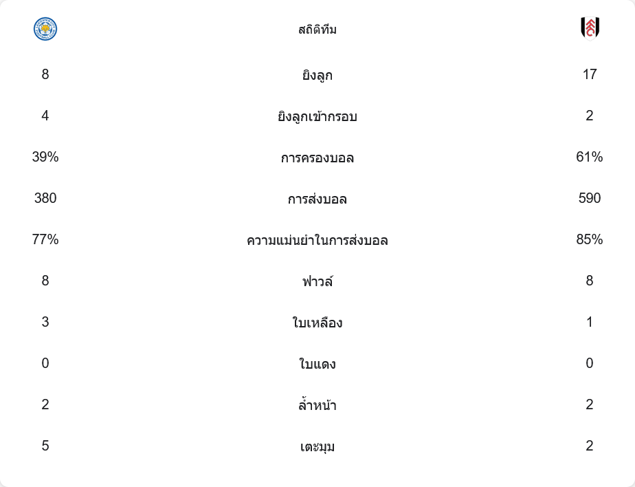 แม้ทีมเยือนจะครองบอลถึง 61% เทียบกับเลสเตอร์ที่มีเพียง 39% แต่พวกเขายังไม่สามารถเจาะแนวรับของ “จิ้งจอกสยาม” ได้สำเร็จ เนื่องจากเกมรับของเจ้าบ้านยังคงเหนียวแน่น นอกจากนี้ แฮร์รี่ วิลสัน ปีกตัวเก่งของฟูแล่มยังสร้างความอันตรายหลายครั้ง แต่ก็ยังไม่สามารถเปลี่ยนเป็นสกอร์ได้