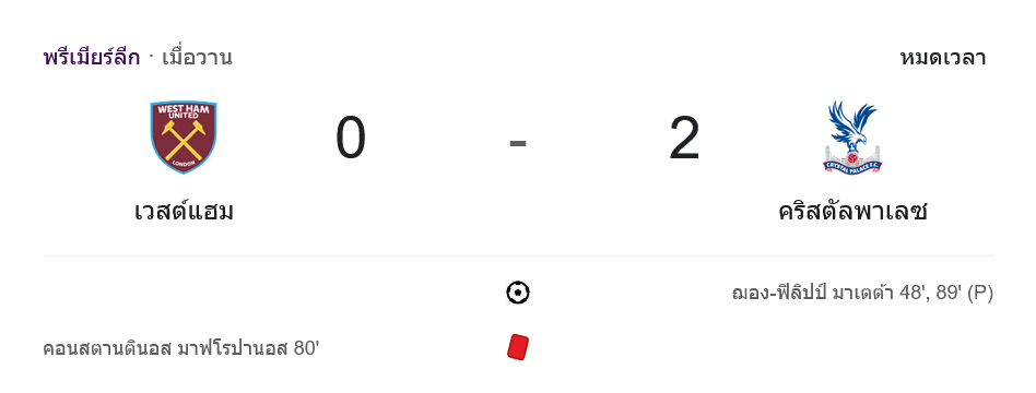 จาก : ผลบอลสด พรีเมียร์ลีก 2024 ระหว่าง เวสต์แฮมยูไนเต็ด 0-2 คริสตัล พาเลซ วันนี้ 18/1/68 – บ้านกีฬา