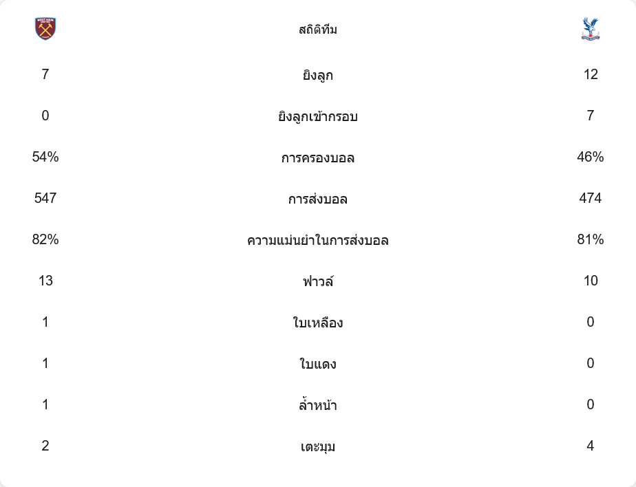 เวสต์แฮม ยูไนเต็ด ยิงทั้งหมด 7 ครั้ง แต่ไม่สามารถยิงเข้ากรอบเลย ในขณะที่ คริสตัล พาเลซ มีโอกาสยิง 12 ครั้ง และเข้ากรอบ 7 ครั้ง พาเลซแม้จะครองบอลน้อยกว่าแต่มีความแม่นยำในการจ่ายบอล 81% และมีเกมรับที่เหนียวแน่น เวสต์แฮมได้ 1 ใบเหลือง และ 1 ใบแดง ขณะที่พาเลซไม่มีผู้เล่นคนใดโดนใบเหลืองหรือใบแดง