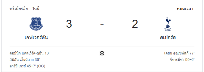 การแข่งขันจบลงด้วยชัยชนะของเอฟเวอร์ตัน 3-2 แม้สเปอร์สจะพยายามอย่างหนักในช่วงท้ายเกม แต่แนวรับของเจ้าบ้านสามารถป้องกันไว้ได้อย่างเหนียวแน่น ถือเป็นชัยชนะที่สมศักดิ์ศรีสำหรับ “ท็อฟฟี่สีน้ำเงิน”