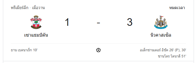 นาทีที่ 47: กรรมการทดเวลาบาดเจ็บ 3 นาที และเป่านกหวีดจบครึ่งแรก นิวคาสเซิลนำเซาแธมป์ตัน 2-1