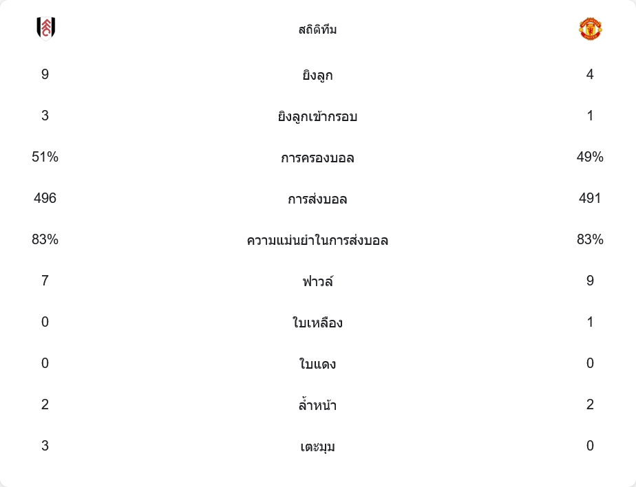 ฟูแล่มมีโอกาสยิงมากกว่าที่ 9 ครั้ง ขณะที่แมนยูยิงเพียง 4 ครั้ง โดยมีแค่ลูกยิงของ มาร์ติเนซ ที่เข้ากรอบและเป็นประตู เกมนี้มีอัตราการครองบอลใกล้เคียงกัน ฟูแล่ม 51% แมนยู 49% การส่งบอลของทั้งสองทีมอยู่ในระดับสูง โดยฟูแล่มส่งบอล 496 ครั้ง ส่วนแมนยูส่ง 491 ครั้ง ความแม่นยำในการจ่ายบอลของทั้งคู่เท่ากันที่ 83% ฟูแล่มทำฟาวล์ 7 ครั้ง ส่วนแมนยูฟาวล์ 9 ครั้ง และได้รับใบเหลือง 1 ใบ