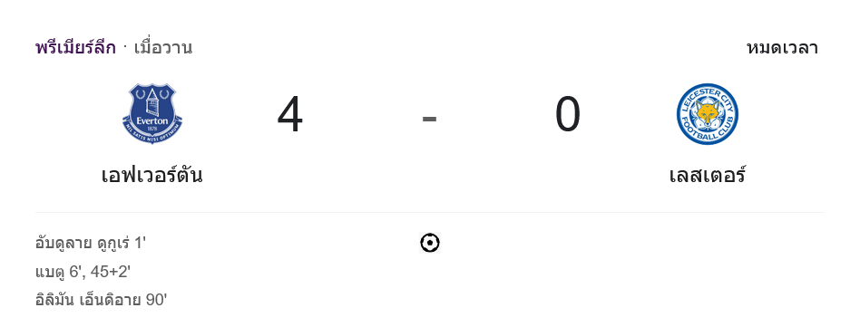 กลับมาในครึ่งหลัง เอฟเวอร์ตันยังคงคุมเกมได้อย่างเหนียวแน่น แม้เลสเตอร์จะพยายามบุกหนักแต่ไม่สามารถเจาะแนวรับของเจ้าถิ่นได้ จนกระทั่งนาทีที่ 90 Iliman Ndiaye ยิงปิดกล่องให้เอฟเวอร์ตันชนะขาดลอย 4-0 อย่างสวยงาม