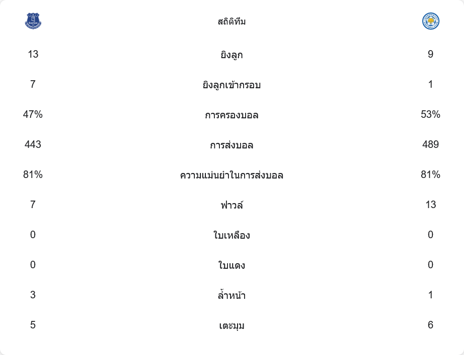 เลสเตอร์ ซิตี้ แม้จะครองบอลได้มากกว่าเล็กน้อย (53%) แต่เกมรุกขาดความเฉียบขาด การจ่ายบอลขาดความแม่นยำในจังหวะสุดท้าย ขณะที่แนวรับก็มีปัญหาในการประกบตัวและรับมือกับการโจมตีที่รวดเร็วของเอฟเวอร์ตัน