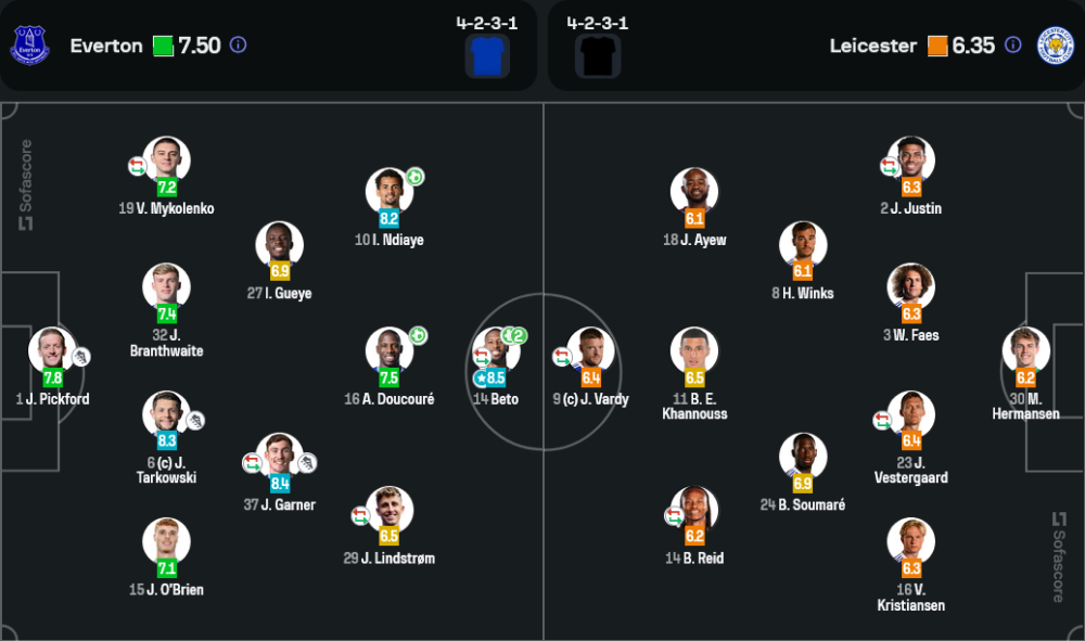 เอฟเวอร์ตัน ใช้แผน 4-2-3-1 เน้นเกมบุกที่มีความเร็วและแม่นยำ การประสานงานระหว่าง Beto, Doucouré และ Garner ทำให้เกมรุกดุดันและเจาะแนวรับของเลสเตอร์ได้อย่างง่ายดาย แดนกลางควบคุมจังหวะเกมได้ดี ขณะที่แนวรับแข็งแกร่งภายใต้การคุมเกมของ Tarkowski