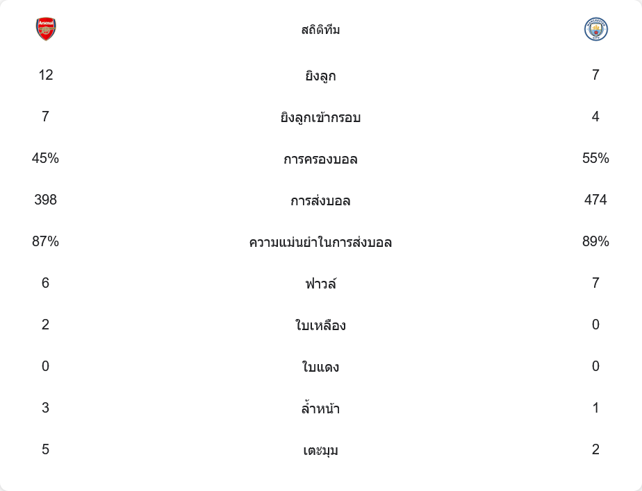แม้ แมนฯ ซิตี้ จะครองบอลได้มากกว่า (55% ต่อ 45%) และมีการส่งบอลแม่นยำกว่า (89% ต่อ 87%) แต่ อาร์เซน่อล กลับสร้างโอกาสยิงได้มากกว่า (12 ครั้ง เข้ากรอบ 7) เทียบกับซิตี้ (7 ครั้ง เข้ากรอบ 4) เกมนี้แสดงให้เห็นถึงความเฉียบคมในการจบสกอร์ของปืนใหญ่ที่ทำได้อย่างยอดเยี่ยม